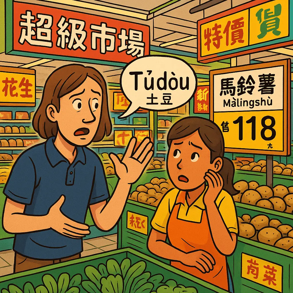 That evening, I recounted the tale to my girlfriend. She laughed and pointed out that while potatoes may be called tǔdòu in China, in Taiwan they are mǎlíngshǔ (馬鈴薯), the term tǔdòu in Taiwan typically means peanuts so it was no wonder that the store assistant was puzzled by the idiot who was trying to buy four peanuts!